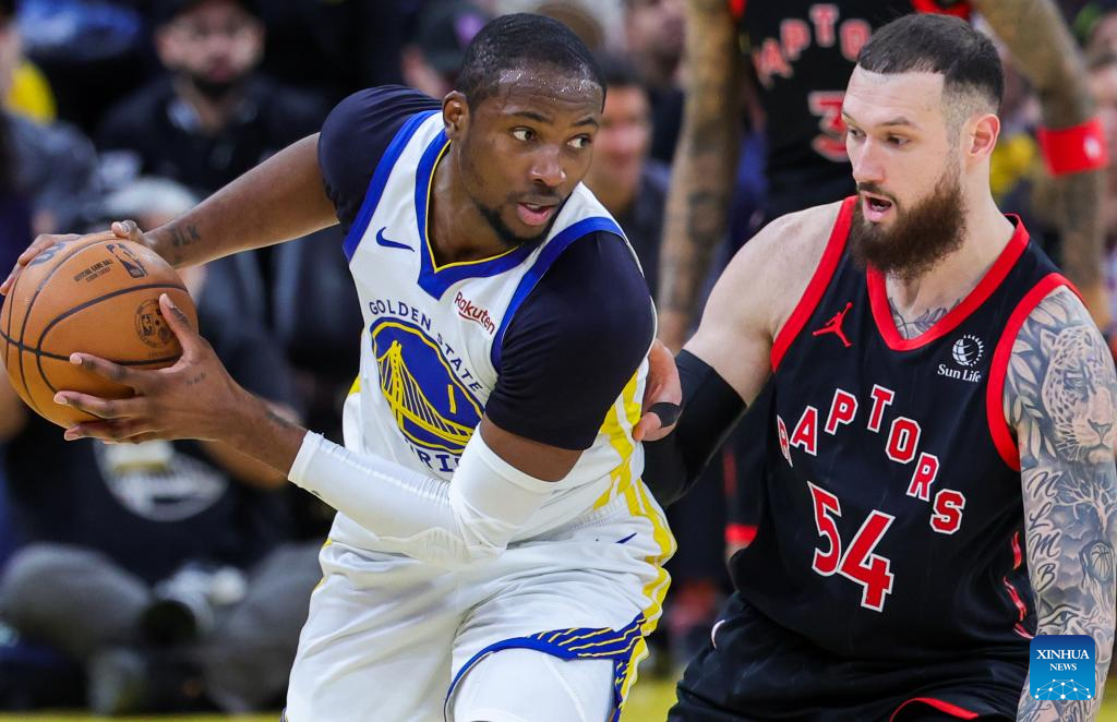 Golden State Warriors' Jonathan Kuminga (L) competes during the 2025-2026 NBA regular season basketball game between Golden State Warriors and Toronto Raptors in San Francisco, the United States, Jan. 20, 2026. (Photo by Arthur Dong/Xinhua)