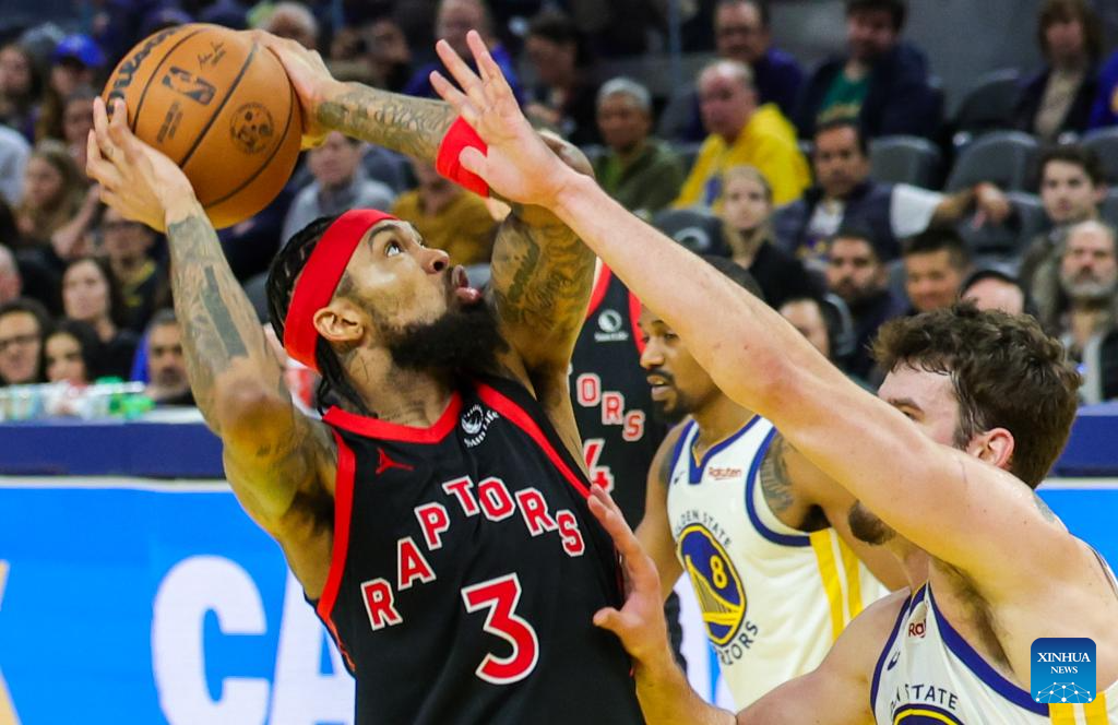 Toronto Raptors' Brandon Ingram (L) shoots during the 2025-2026 NBA regular season basketball game between Golden State Warriors and Toronto Raptors in San Francisco, the United States, Jan. 20, 2026. (Photo by Arthur Dong/Xinhua)