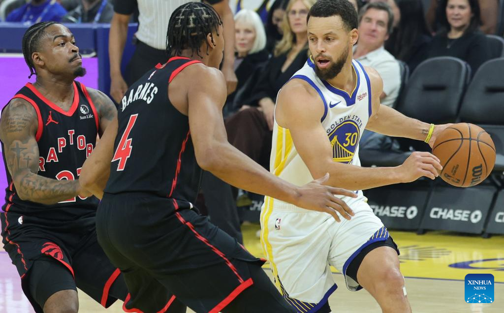 Golden State Warriors' Stephen Curry (R) drives the ball during the 2025-2026 NBA regular season basketball game between Golden State Warriors and Toronto Raptors in San Francisco, the United States, Jan. 20, 2026. (Photo by Arthur Dong/Xinhua)