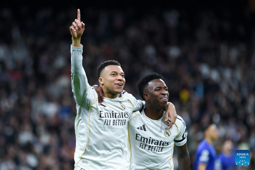 Real Madrid's Kylian Mbappe (L) celebrates a goal with teammate Vinicius Junior during the UEFA Champions League match between Real Madrid and AS Monaco, Madrid, Spain, Jan. 20, 2026. (Photo by Gustavo Valiente/Xinhua)