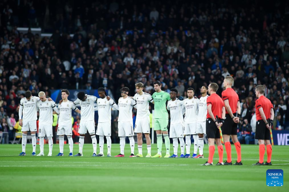 Real Madrid's players during a minute of silence for the train crash victims before the UEFA Champions League match between Real Madrid and AS Monaco, Madrid, Spain, Jan. 20, 2026. (Photo by Gustavo Valiente/Xinhua)