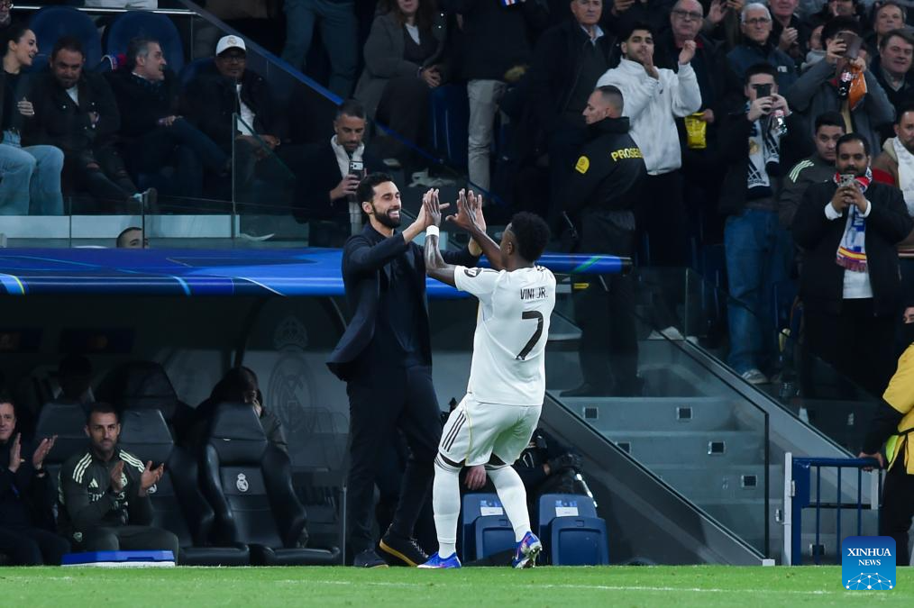 Real Madrid's Vinicius Junior (R) celebrates his goal with head coach Alvaro Arbeloa during the UEFA Champions League match between Real Madrid and AS Monaco, Madrid, Spain, Jan. 20, 2026. (Photo by Gustavo Valiente/Xinhua)