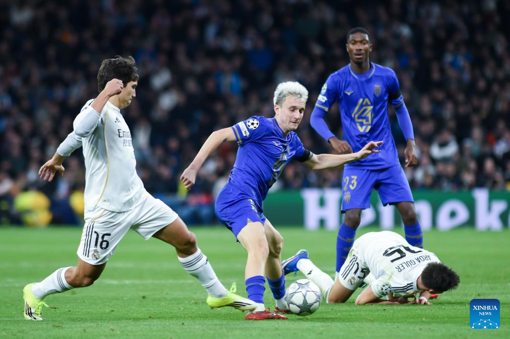 Real Madrid's Gonzalo Garcia (1st L) vies with AS Monaco's Golovin (2nd L) during the UEFA Champions League match between Real Madrid and AS Monaco, Madrid, Spain, Jan. 20, 2026. (Photo by Gustavo Valiente/Xinhua)