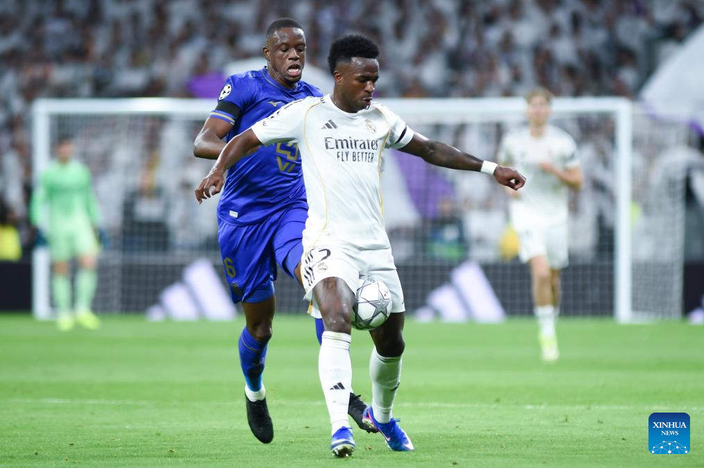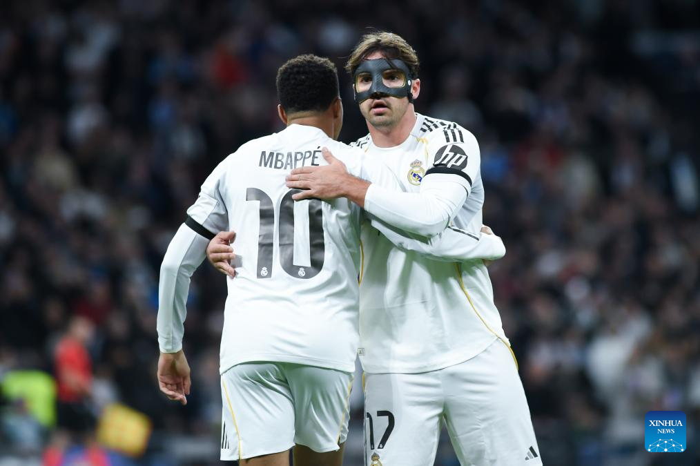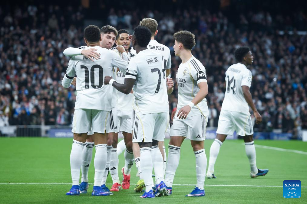 Real Madrid's players celebrate a goal during the UEFA Champions League match between Real Madrid and AS Monaco, Madrid, Spain, Jan. 20, 2026. (Photo by Gustavo Valiente/Xinhua)