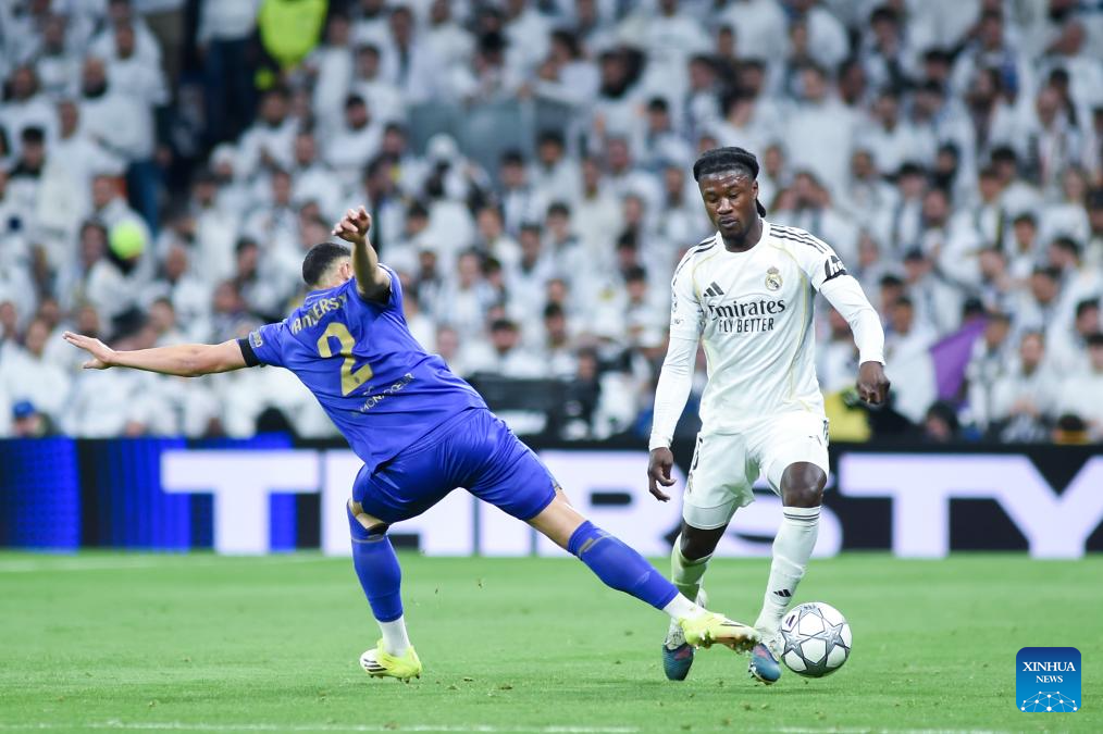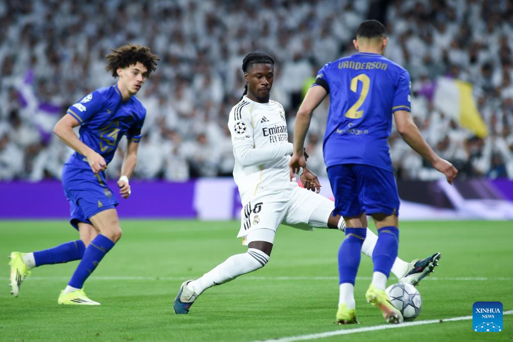 Real Madrid's Eduardo Camavinga (C) competes during the UEFA Champions League match between Real Madrid and AS Monaco, Madrid, Spain, Jan. 20, 2026. (Photo by Gustavo Valiente/Xinhua)