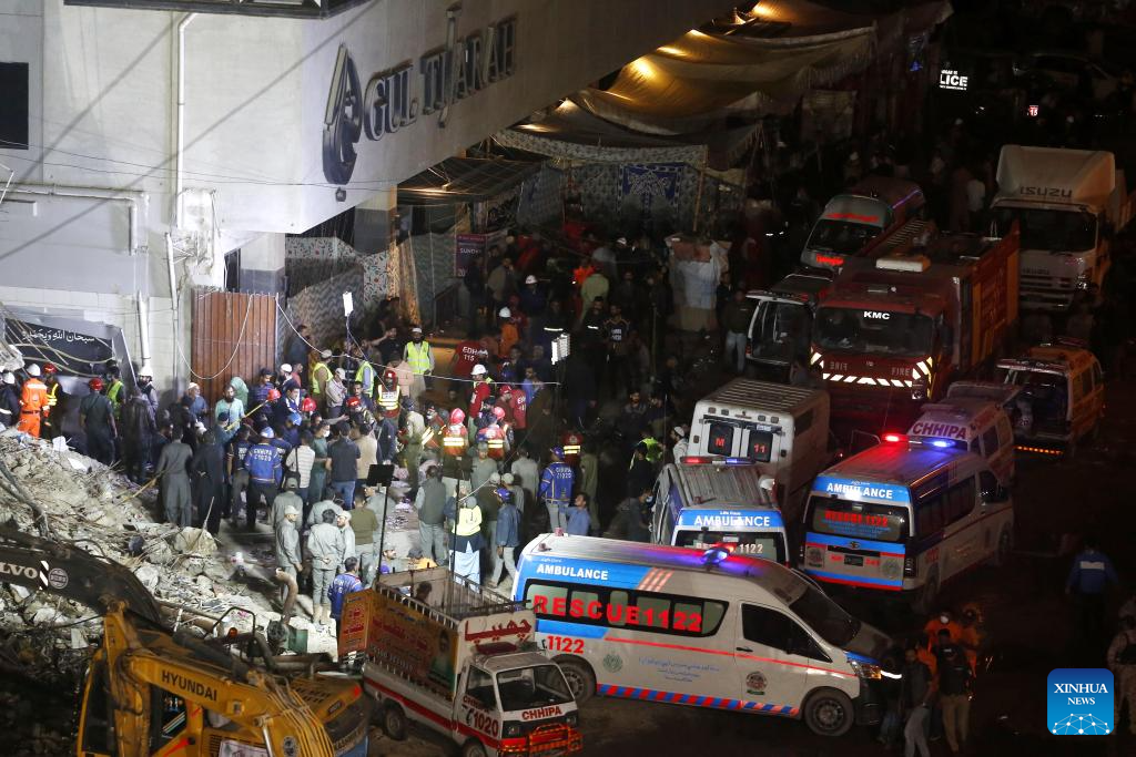 Rescuers gather at the fire site of a shopping mall in southern Pakistani port city of Karachi on Jan. 21, 2026. The death toll from a shopping mall fire in Pakistan's southern port city of Karachi climbed to 60 after at least 30 bodies were recovered from a shop of the multi-storey building, officials said on Wednesday. (Str/Xinhua)