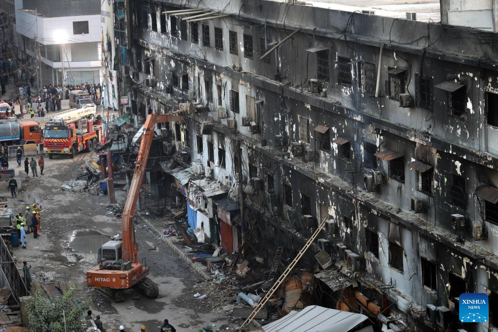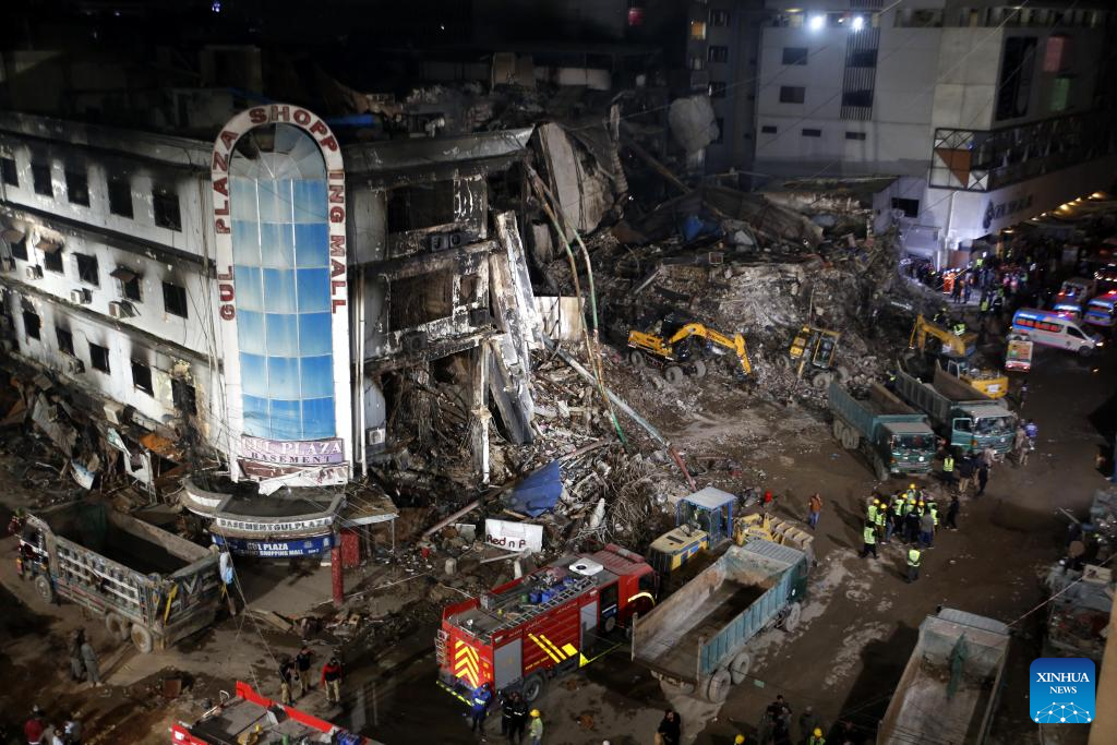 Rescuers use heavy machinery to remove debris at the fire site of a shopping mall in southern Pakistani port city of Karachi on Jan. 21, 2026. The death toll from the fire at a shopping mall in Pakistan's southern port city of Karachi surged to 60 after rescue workers recovered several bodies, police officials said on Wednesday. (Str/Xinhua)
