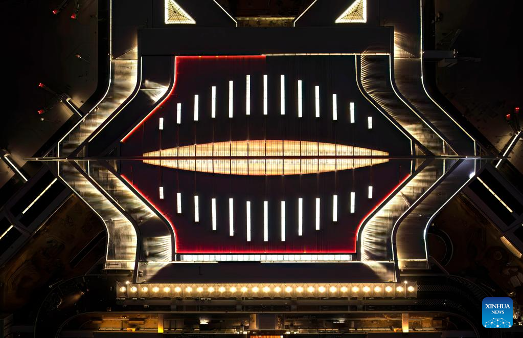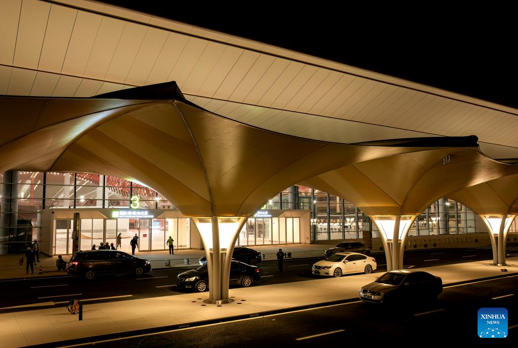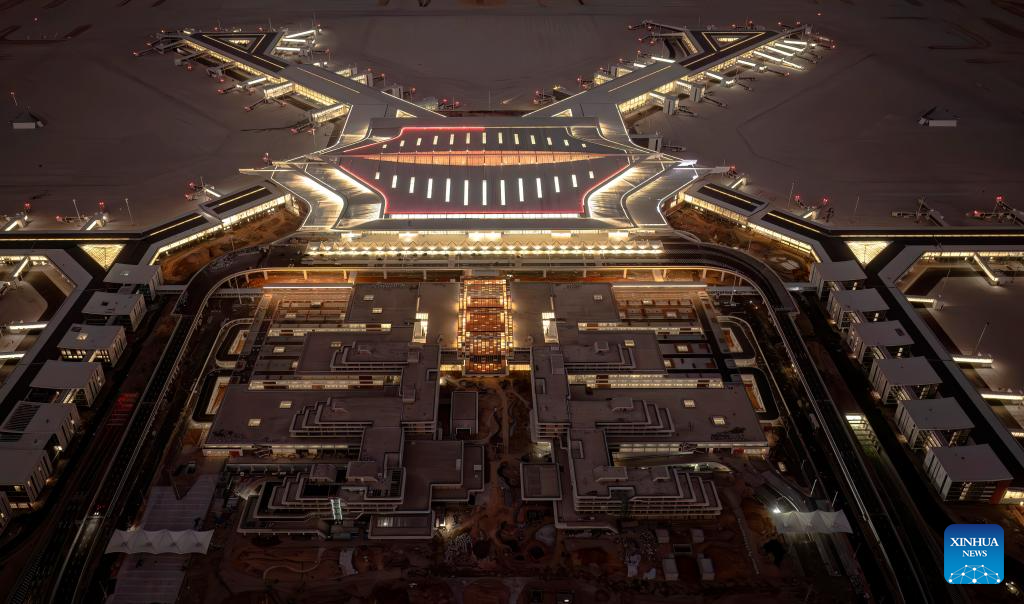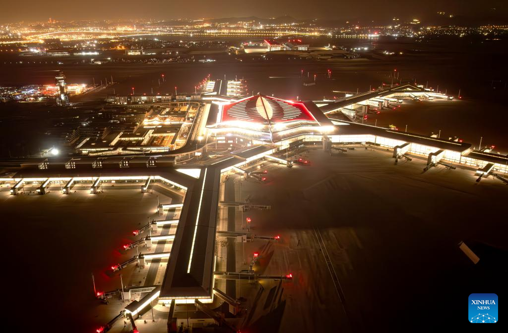 An aerial drone photo taken on Jan. 20, 2026 shows a night view of the Xiamen Xiang'an International Airport in Xiamen, southeast China's Fujian Province. Construction of the Xiamen Xiang'an International Airport has entered a critical phase involving completion acceptance, flight tests and calibrations, and relocation preparations. With its operation slated for late 2026, the airport will be able to handle 45 million passengers, 750,000 tonnes of cargo and mail, as well as 380,000 aircraft take-offs and landings on a yearly basis. (Xinhua/Wei Peiquan)