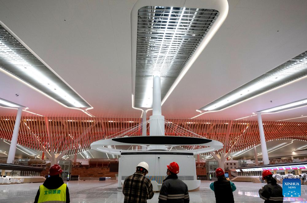 Workers check lighting conditions during an inspection of the power supply systems at the Xiamen Xiang'an International Airport in Xiamen, southeast China's Fujian Province, Jan. 20, 2026. Construction of the Xiamen Xiang'an International Airport has entered a critical phase involving completion acceptance, flight tests and calibrations, and relocation preparations. With its operation slated for late 2026, the airport will be able to handle 45 million passengers, 750,000 tonnes of cargo and mail, as well as 380,000 aircraft take-offs and landings on a yearly basis. (Xinhua/Wei Peiquan)