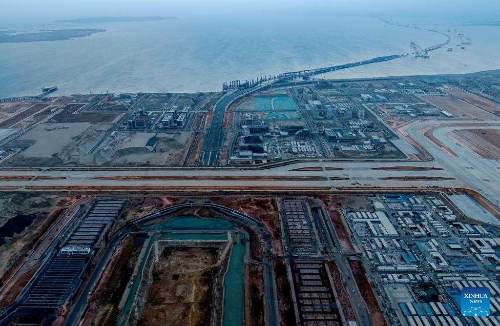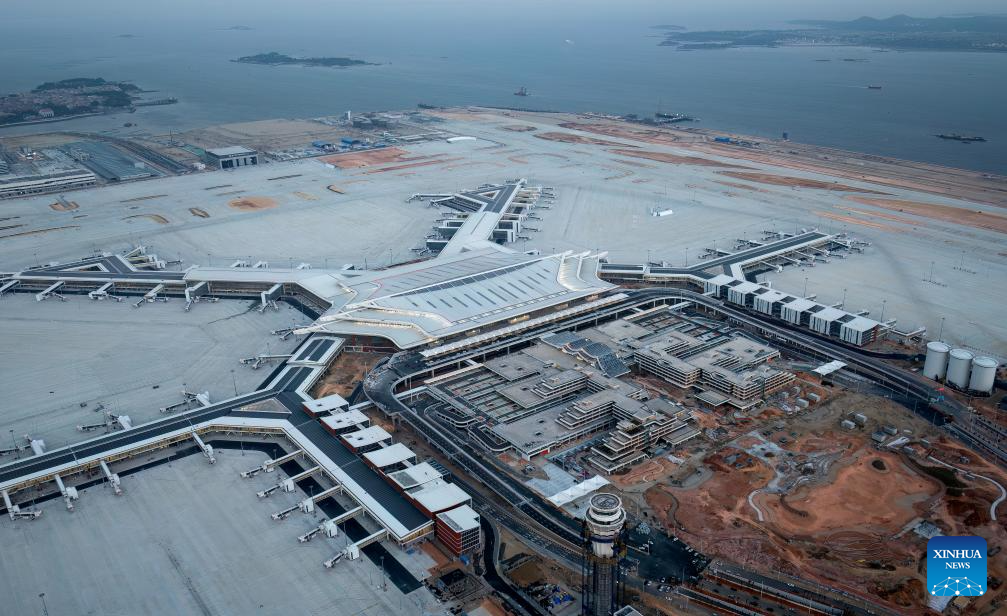 An aerial drone photo taken on Jan. 20, 2026 shows the construction site of the Xiamen Xiang'an International Airport in Xiamen, southeast China's Fujian Province. Construction of the Xiamen Xiang'an International Airport has entered a critical phase involving completion acceptance, flight tests and calibrations, and relocation preparations. With its operation slated for late 2026, the airport will be able to handle 45 million passengers, 750,000 tonnes of cargo and mail, as well as 380,000 aircraft take-offs and landings on a yearly basis. (Xinhua/Wei Peiquan)