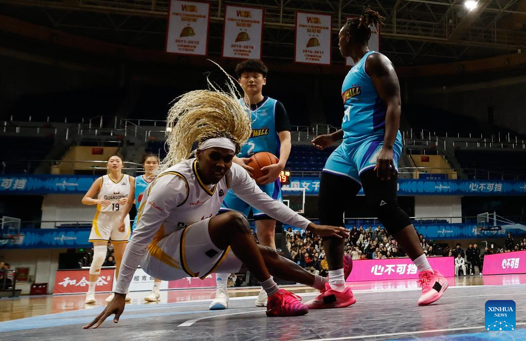 Aliyah Collier (Front) of Guangdong Vermilion Birds competes during the 18th round regular season match between Beijing Great Wall and Guangdong Vermilion Birds at the 2025-2026 Women's Chinese Basketball Association (WCBA) league in Beijing, China, Jan. 20, 2026. (Xinhua/Wang Lili)