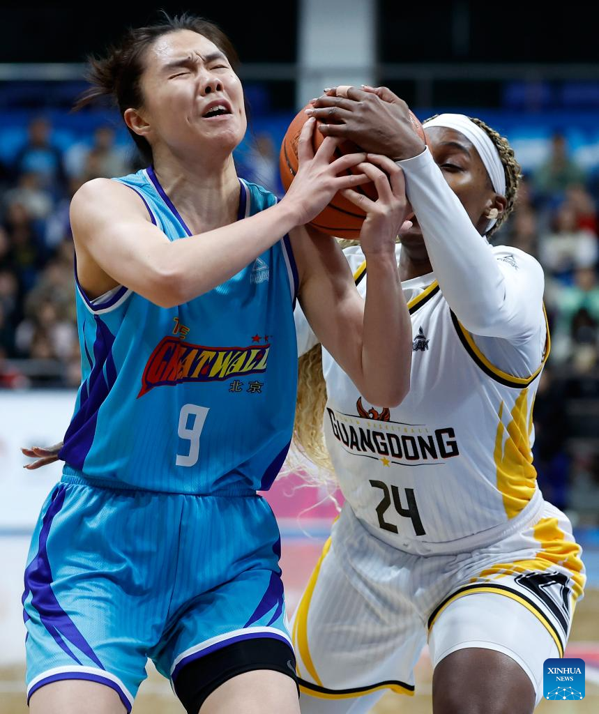 Aliyah Collier (R) of Guangdong Vermilion Birds vies with Liu Jiaqi of Beijing Great Wall during the 18th round regular season match between Beijing Great Wall and Guangdong Vermilion Birds at the 2025-2026 Women's Chinese Basketball Association (WCBA) league in Beijing, China, Jan. 20, 2026. (Xinhua/Wang Lili)
