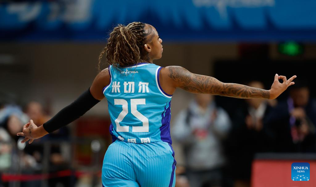 Tiffany Mitchell of Beijing Great Wall celebrates scoring during the 18th round regular season match between Beijing Great Wall and Guangdong Vermilion Birds at the 2025-2026 Women's Chinese Basketball Association (WCBA) league in Beijing, China, Jan. 20, 2026. (Xinhua/Wang Lili)