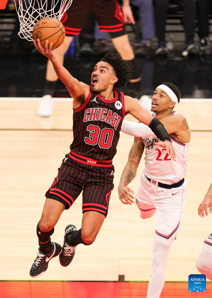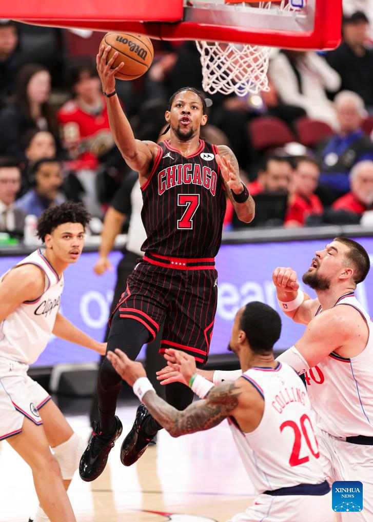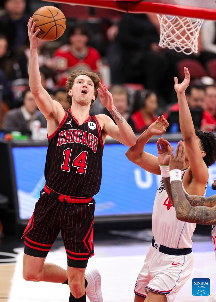 Chicago Bulls' Dalen Terry (top) drives to the basket during the 2025-2026 NBA regular season basketball game between Los Angeles Clippers and Chicago Bulls at United Center in Chicago, the United States, Jan. 20, 2026. (Photo by Joel Lerner/Xinhua)