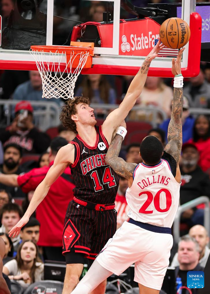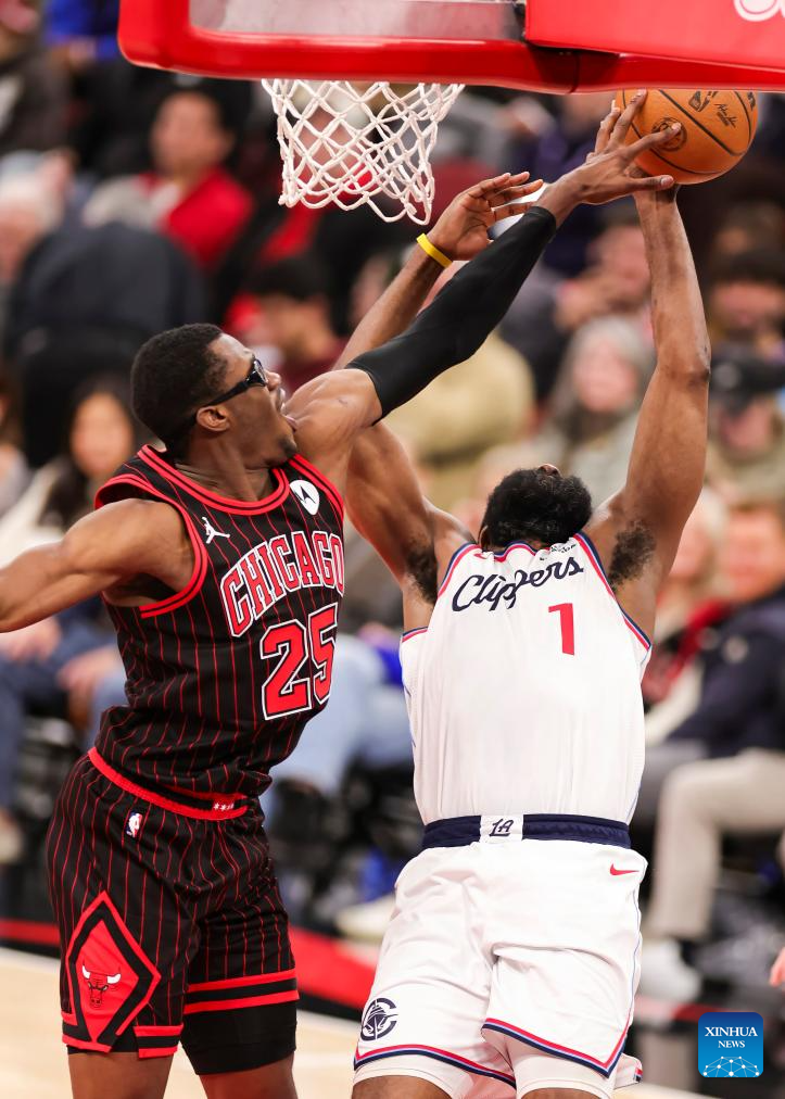 Chicago Bulls' Matas Buzelis (L) blocks the shot of LA Clippers' John Collins during the 2025-2026 NBA regular season basketball game between Los Angeles Clippers and Chicago Bulls at United Center in Chicago, the United States, Jan. 20, 2026. (Photo by Joel Lerner/Xinhua)