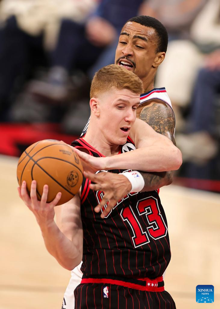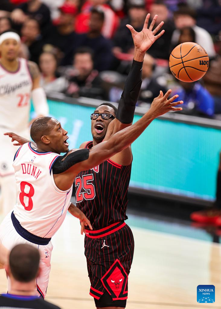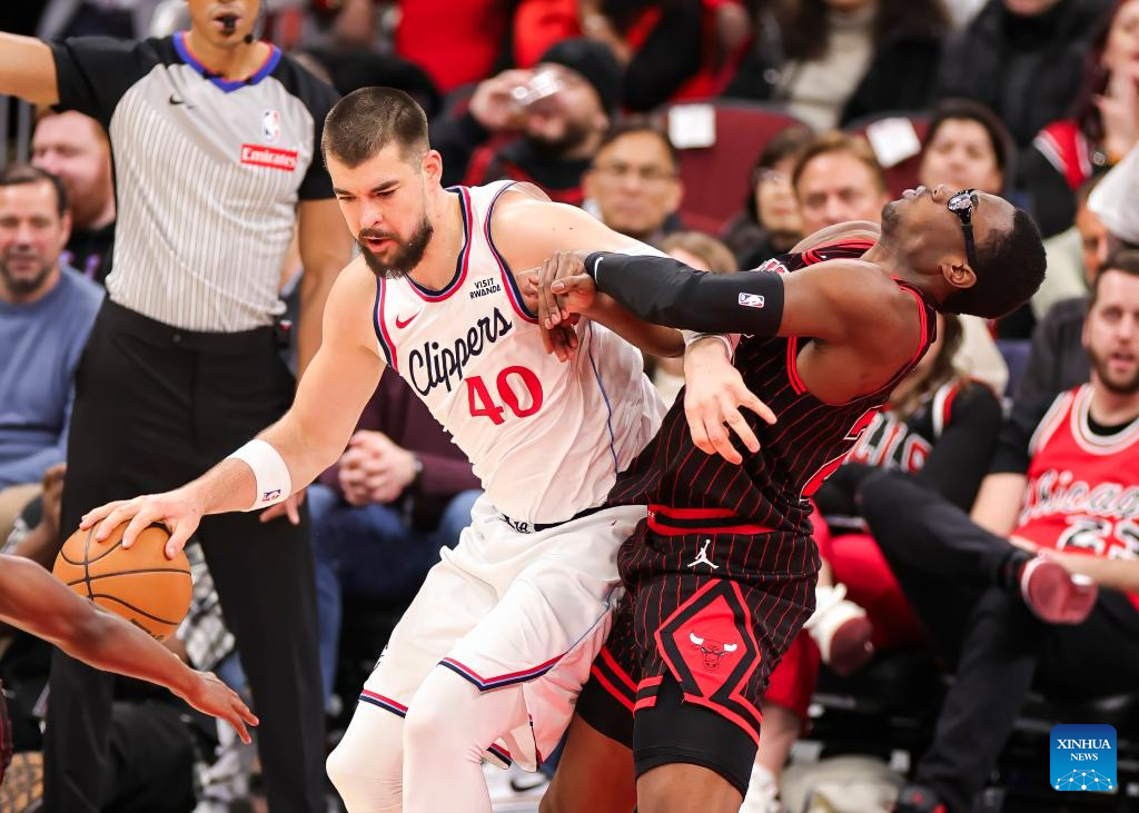 Chicago Bulls' Kevin Huerter (front) and Los Angeles Clippers' John Collins battle for a rebound during the 2025-2026 NBA regular season basketball game between Los Angeles Clippers and Chicago Bulls at United Center in Chicago, the United States, Jan. 20, 2026. (Photo by Joel Lerner/Xinhua)