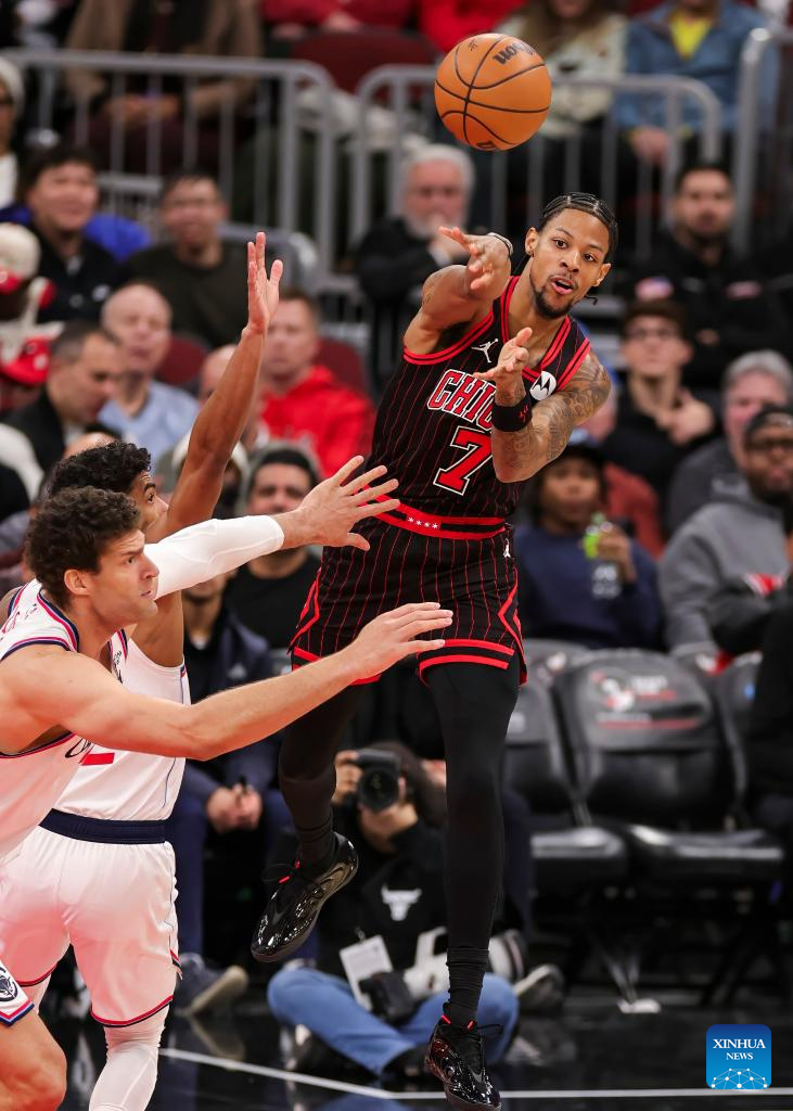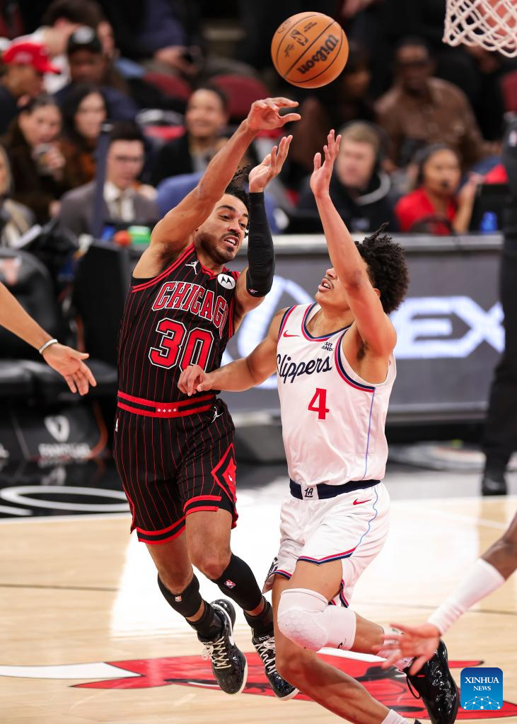 Chicago Bulls' Dalen Terry (R) throws a pass during the 2025-2026 NBA regular season basketball game between Los Angeles Clippers and Chicago Bulls at United Center in Chicago, the United States, Jan. 20, 2026. (Photo by Joel Lerner/Xinhua)