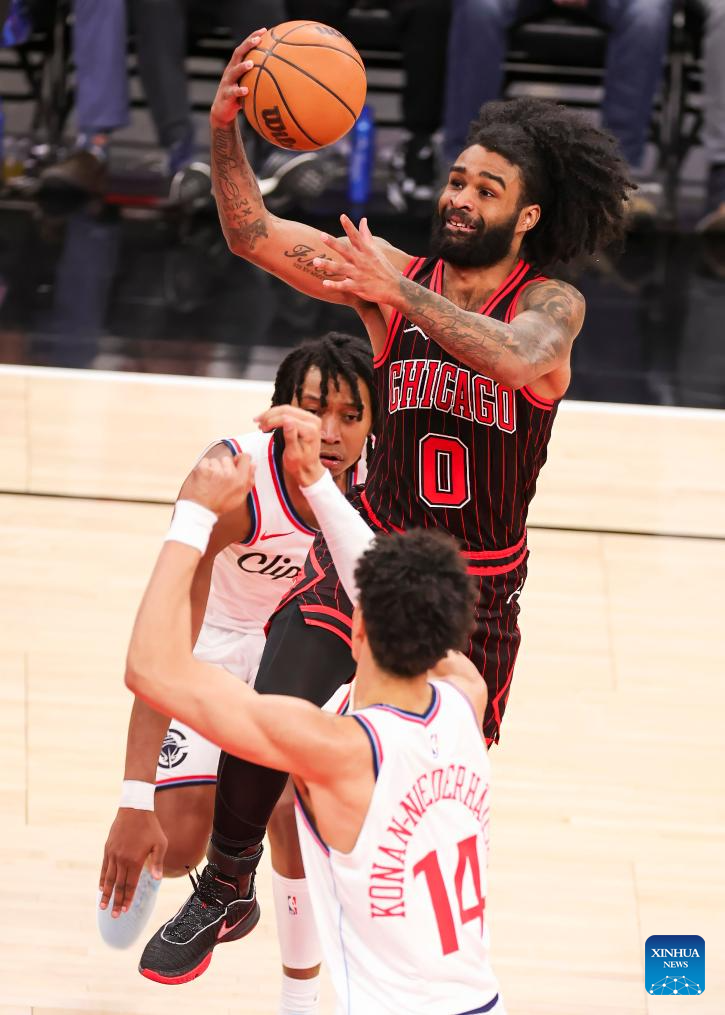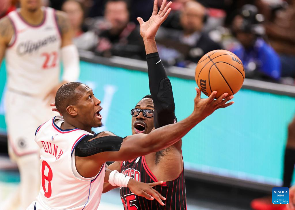Chicago Bulls' Coby White (top) drives to the basket during the 2025-2026 NBA regular season basketball game between Los Angeles Clippers and Chicago Bulls at United Center in Chicago, the United States, Jan. 20, 2026. (Photo by Joel Lerner/Xinhua)