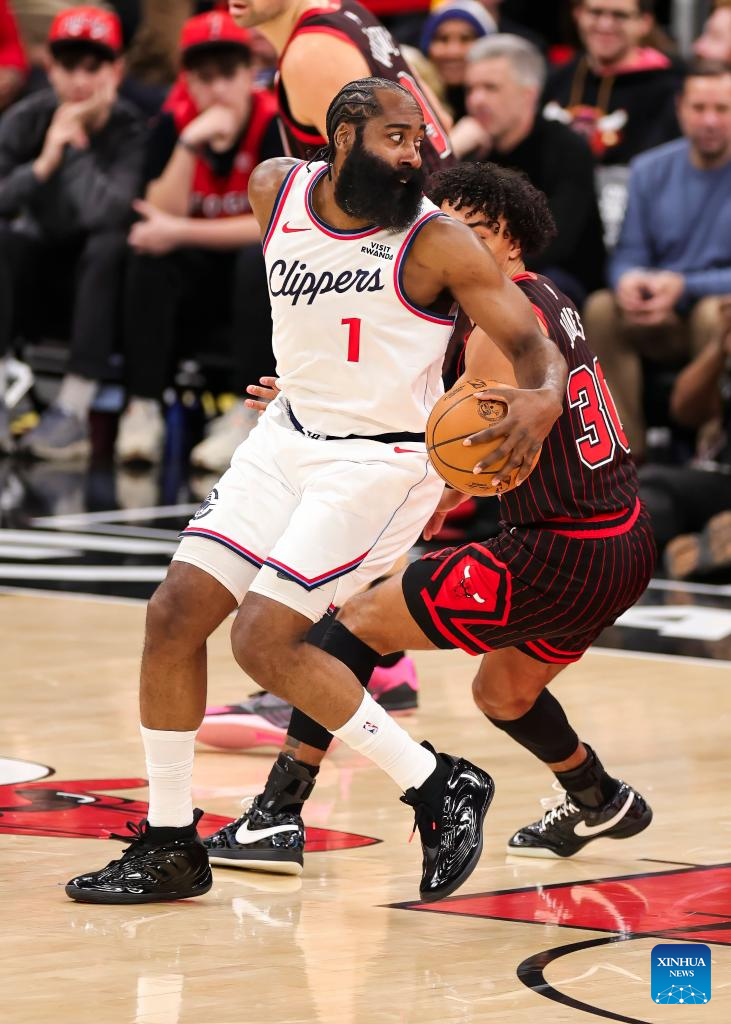 Los Angeles Clippers' James Harden (L) makes a move during the 2025-2026 NBA regular season basketball game between Los Angeles Clippers and Chicago Bulls at United Center in Chicago, the United States, Jan. 20, 2026. (Photo by Joel Lerner/Xinhua)