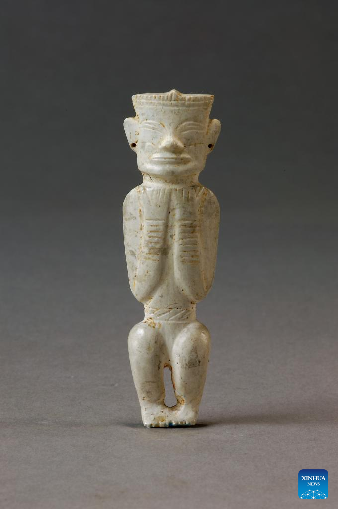 This undated file photo shows a jade figurine unearthed from the Lingjiatan relics site in Hanshan County, Ma'anshan, east China's Anhui Province. The Lingjiatan relics site in east China's Anhui is a Neolithic settlement dating back 5,300 to 5,800 years, with an area of about 1.6 million square meters.