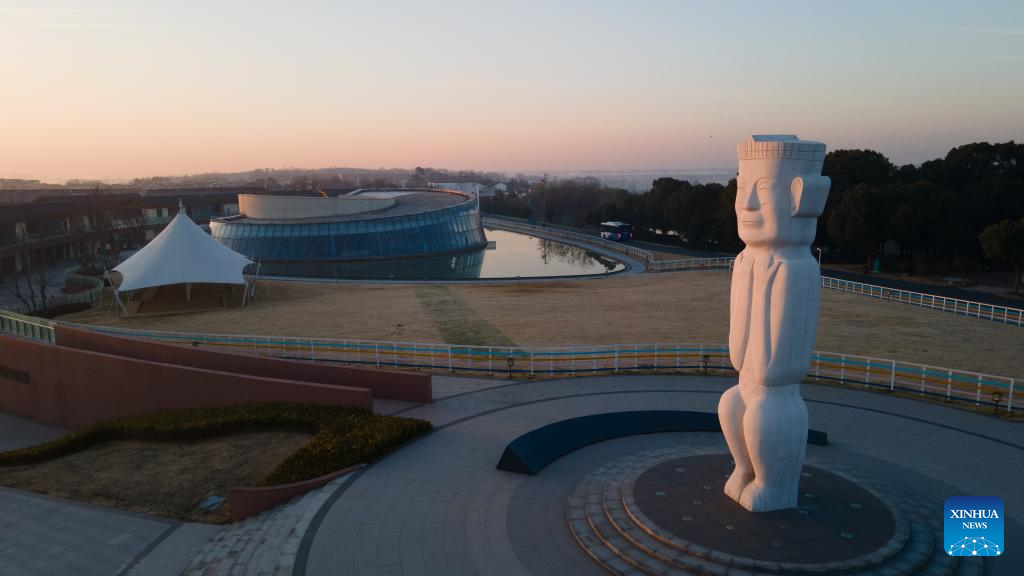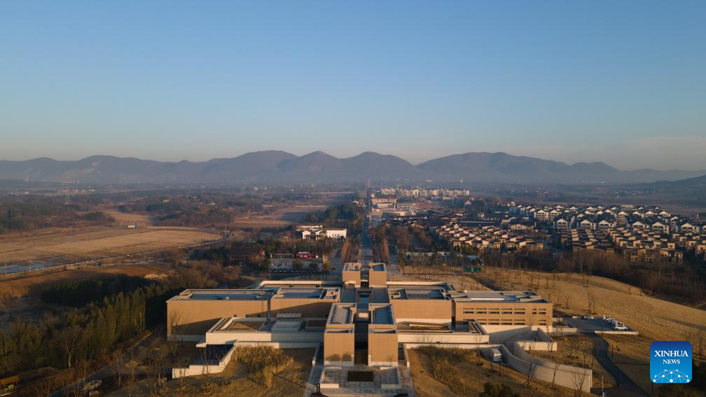 An aerial drone photo taken on Jan. 14, 2026 shows an education center of the Lingjiatan relics site in Hanshan County, Ma'anshan, east China's Anhui Province. The Lingjiatan relics site in east China's Anhui is a Neolithic settlement dating back 5,300 to 5,800 years, with an area of about 1.6 million square meters.