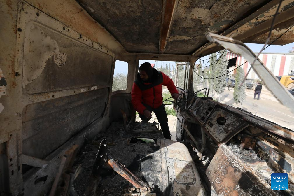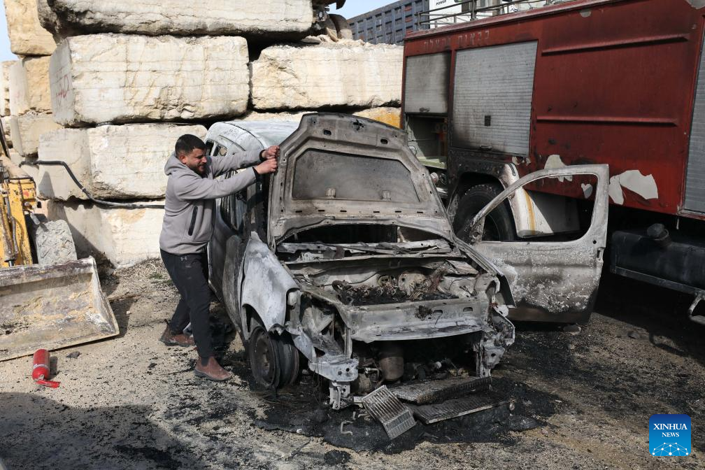 A Palestinian inspects the aftermath of a fire set ablaze by Israeli settlers that damaged cars, in the village of Awarta, south of Nablus in the West Bank, Jan. 21, 2026. (Photo by Nidal Eshtayeh/Xinhua)