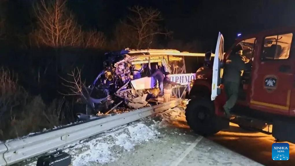 The site of a bus accident is seen in Russia's Primorsky Krai on Jan. 22, 2026. At least three people were killed and eight others injured on Thursday when a bus collided with a truck in Russia's Primorsky Krai, media reported. According to Vladivostok News, the accident occurred on a highway in the Khasan district of Primorsky Krai. The truck lost control and veered into the oncoming lane, causing the collision. Of the 14 people on board the bus, the driver and two passengers were killed. (Government of Khasan district of Primorsky Krai/Handout via Xinhua)