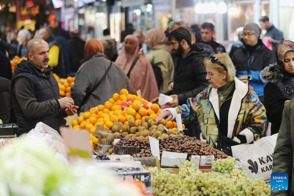 People shop at a local market in Ankara, Türkiye, on Jan. 22, 2026. Türkiye's central bank cut its benchmark interest rate by 100 basis points to 37 percent on Thursday, continuing a gradual cycle of easing as inflation shows signs of cooling. The move marks the fifth reduction since last summer, signaling a cautious shift away from the tight monetary policy previously used to curb soaring prices. (Mustafa Kaya/Handout via Xinhua)