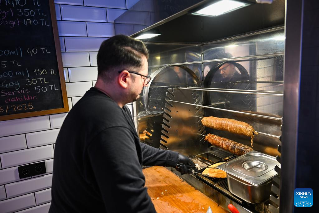 Oguzhan Sayi, owner of Ozzie's eatery, prepares food at his restaurant in Istanbul, Türkiye, Dec. 17, 2025. (Xinhua/Liu Lei)