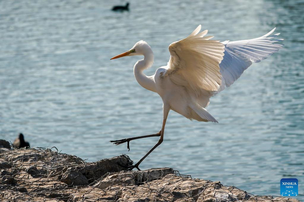 An egret forages at a wetland park in Taiyuan, north China's Shanxi Province, Jan. 22, 2026. An increasing number of migratory birds have chosen to rest and winter at the Fenhe River basin thanks to continuous improvements in the ecological environment in recent years. (Xinhua/Yang Chenguang)