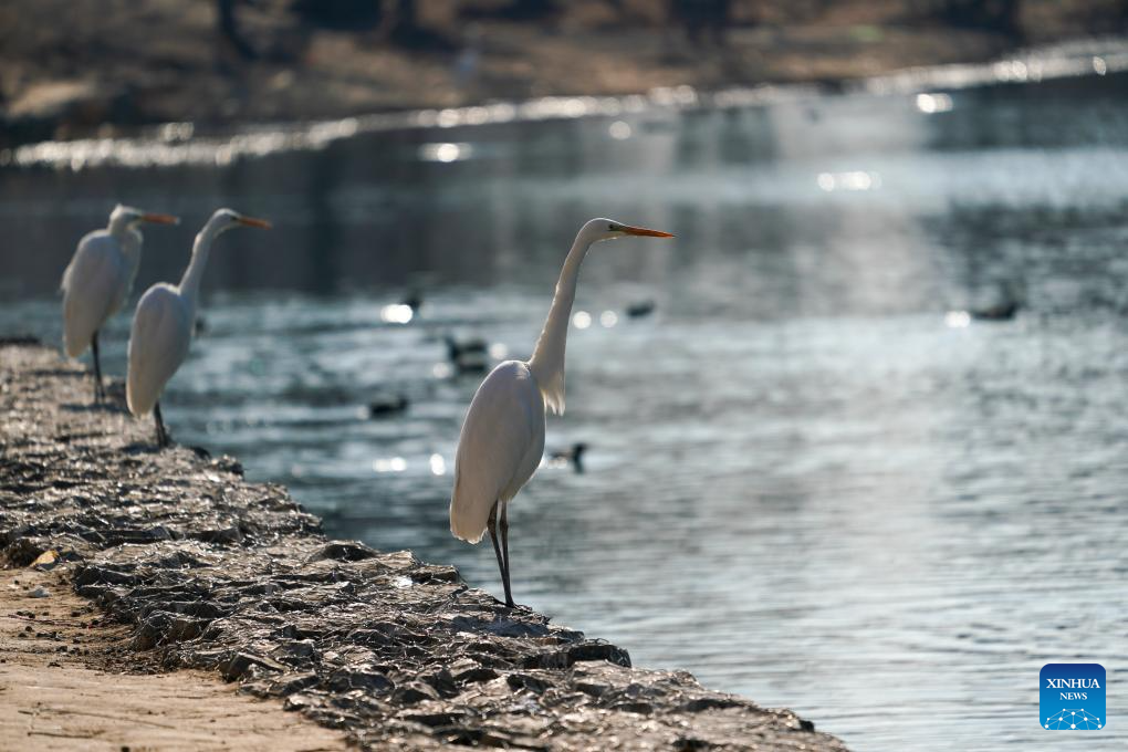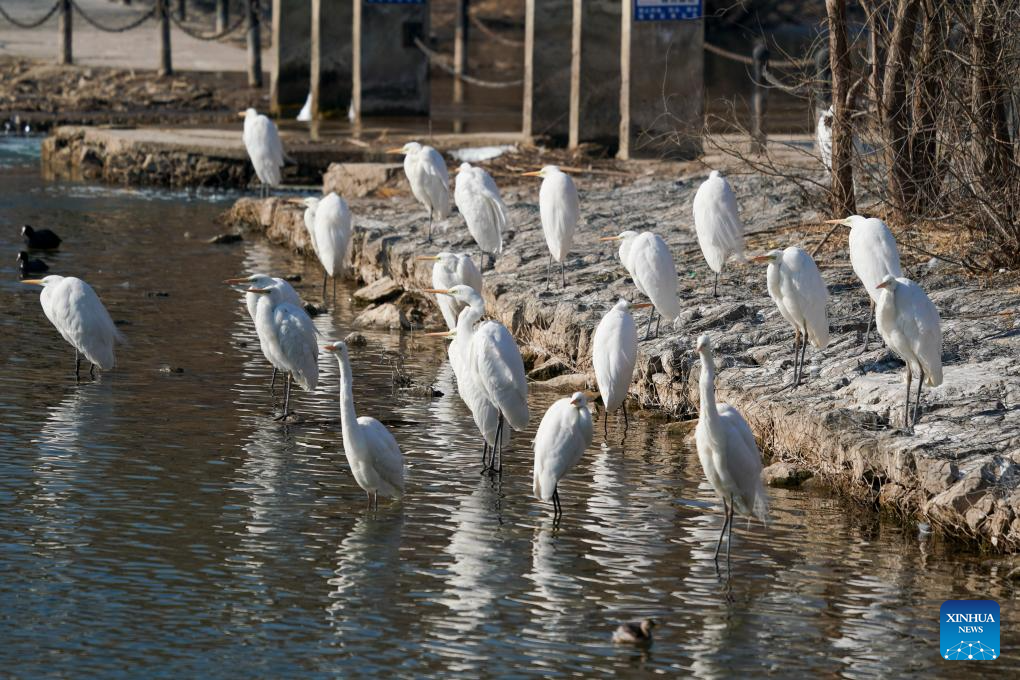 Egrets rest at a wetland park in Taiyuan, north China's Shanxi Province, Jan. 22, 2026. An increasing number of migratory birds have chosen to rest and winter at the Fenhe River basin thanks to continuous improvements in the ecological environment in recent years. (Xinhua/Yang Chenguang)