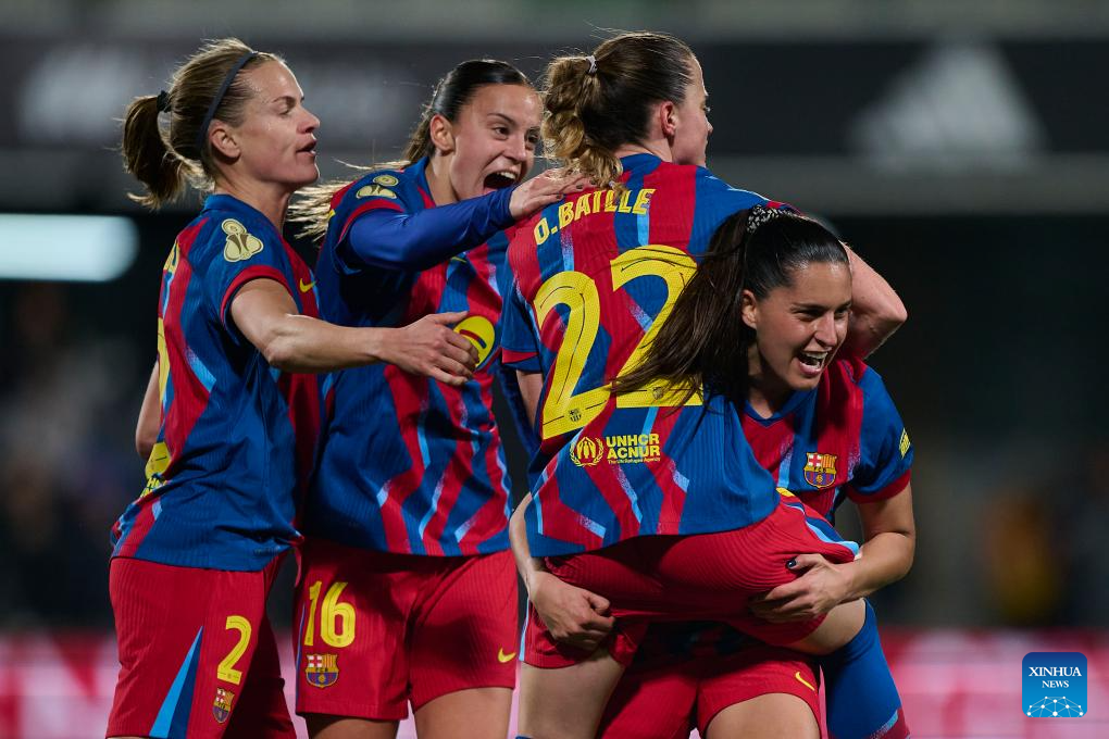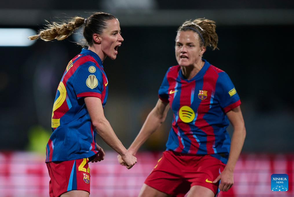 Ona Batlle (2nd R) of Barcelona celebrates a goal with teammates during the Spanish Women Super Cup Match between Barcelona and Athletic Bilbao at Castallia Stadium in Castellon , Spain, Jan. 21, 2026. (Photo by Pablo Morano/Xinhua)