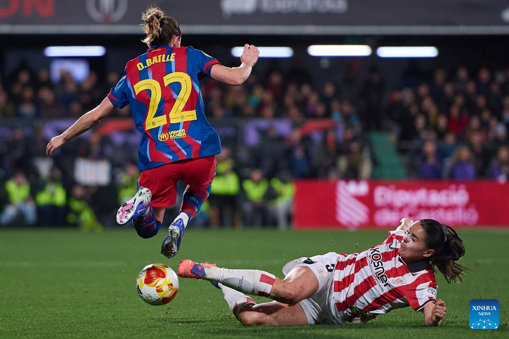 Ona Batlle (L) of Barcelona vies with Daniela Agote of Athletic Bilbao during the Spanish Women Super Cup Match between Barcelona and Athletic Bilbao at Castallia Stadium in Castellon , Spain, Jan. 21, 2026. (Photo by Pablo Morano/Xinhua)