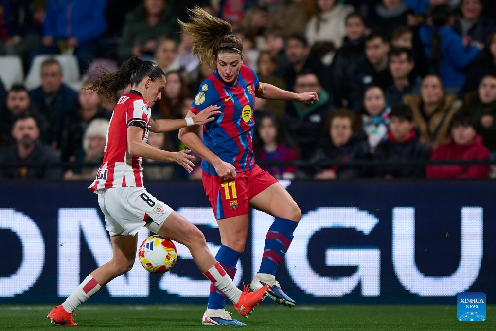 Alexia Putellas (L) of Barcelona vies with Daniela Agote of Athletic Bilbao during the Spanish Women Super Cup Match between Barcelona and Athletic Bilbao at Castallia Stadium in Castellon , Spain, Jan. 21, 2026. (Photo by Pablo Morano/Xinhua)
