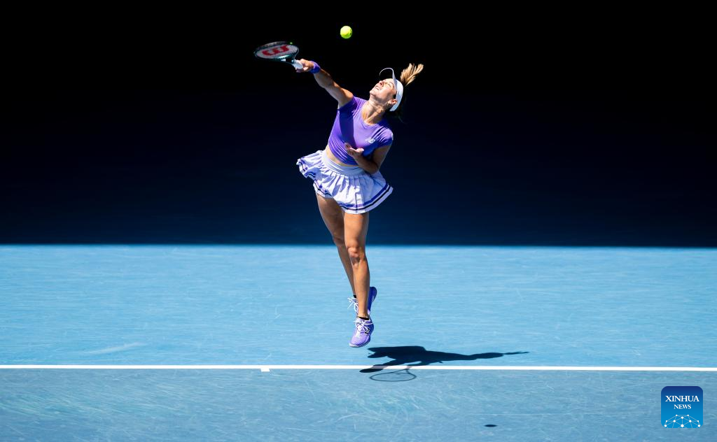 Wang Xinyu of China hits a return during the women's singles 2nd round match against Jelena Ostapenko of Latvia at the Australian Open tennis tournament in Melbourne, Australia, Jan. 22, 2026. (Xinhua/Ma Ping)
