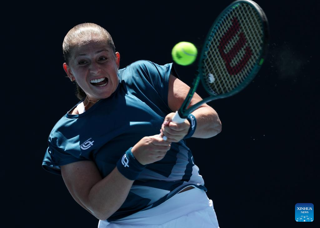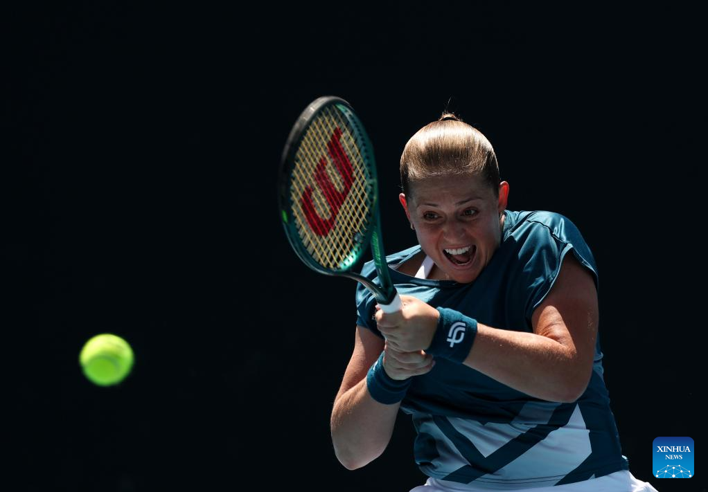 Jelena Ostapenko of Latvia hits a return during the women's singles 2nd round match against Wang Xinyu of China at the Australian Open tennis tournament in Melbourne, Australia, Jan. 22, 2026. (Xinhua/Ma Ping)