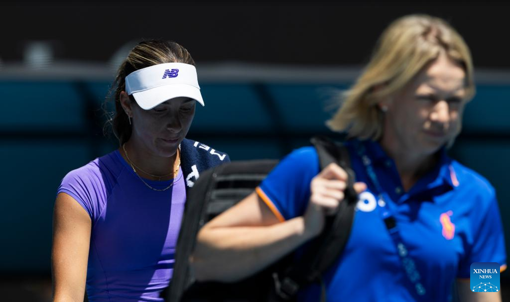 McCartney Kessler of the United States leaves the court after the women's singles 2nd round match against Jessica Pegula of the United States at the Australian Open tennis tournament in Melbourne, Australia, Jan. 22, 2026. (Photo by Hu Jingchen/Xinhua)