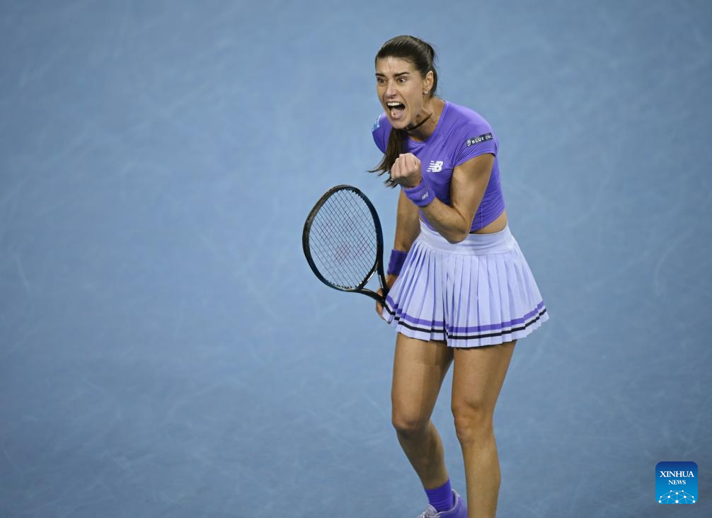 Sorana Cirstea celebrates scoring during the women's singles 2nd round match between Osaka Naomi of Japan and Sorana Cirstea of Romania at the Australian Open tennis tournament in Melbourne, Australia, Jan. 22, 2026. (Photo by Wang Shen/Xinhua)