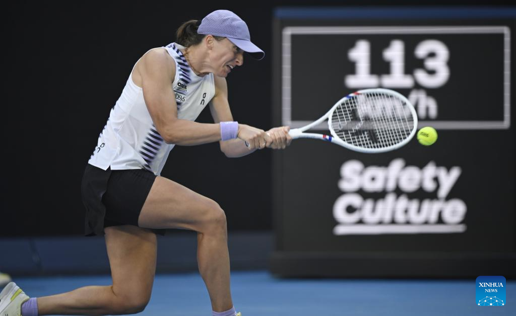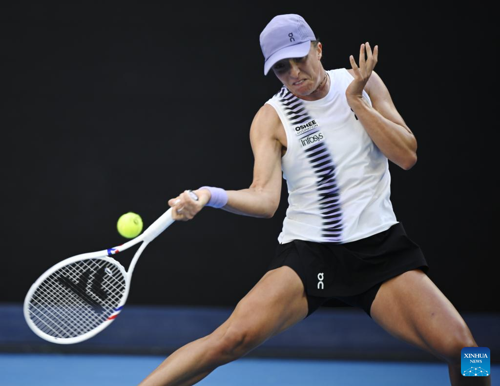 Iga Swiatek of Poland hits a return during the women's singles 2nd round match against Marie Bouzkova of the Czech Republic at the Australian Open tennis tournament in Melbourne, Australia, Jan. 22, 2026. (Photo by Wang Shen/Xinhua)