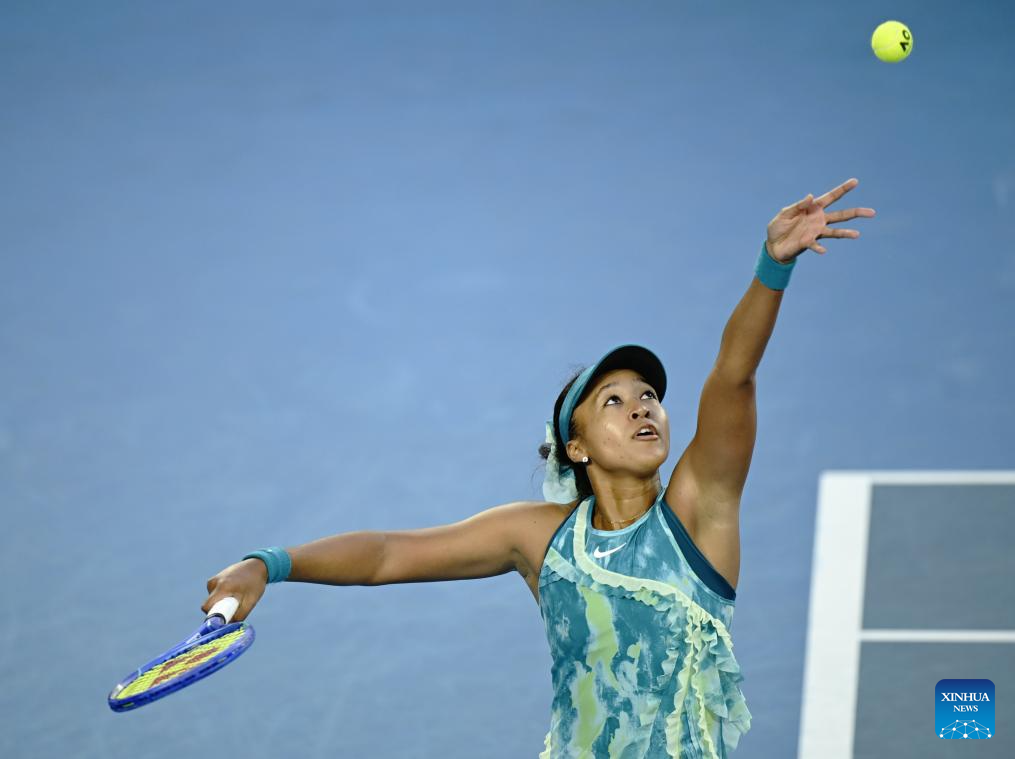 Osaka Naomi serves during the women's singles 2nd round match between Osaka Naomi of Japan and Sorana Cirstea of Romania at the Australian Open tennis tournament in Melbourne, Australia, Jan. 22, 2026. (Photo by Wang Shen/Xinhua)