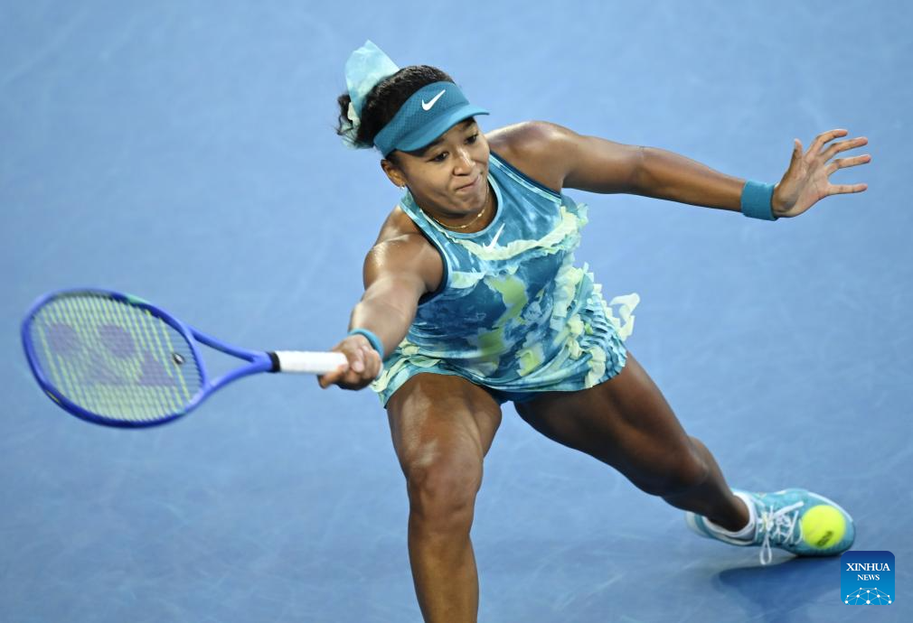Osaka Naomi hits a return during the women's singles 2nd round match between Osaka Naomi of Japan and Sorana Cirstea of Romania at the Australian Open tennis tournament in Melbourne, Australia, Jan. 22, 2026. (Photo by Wang Shen/Xinhua)