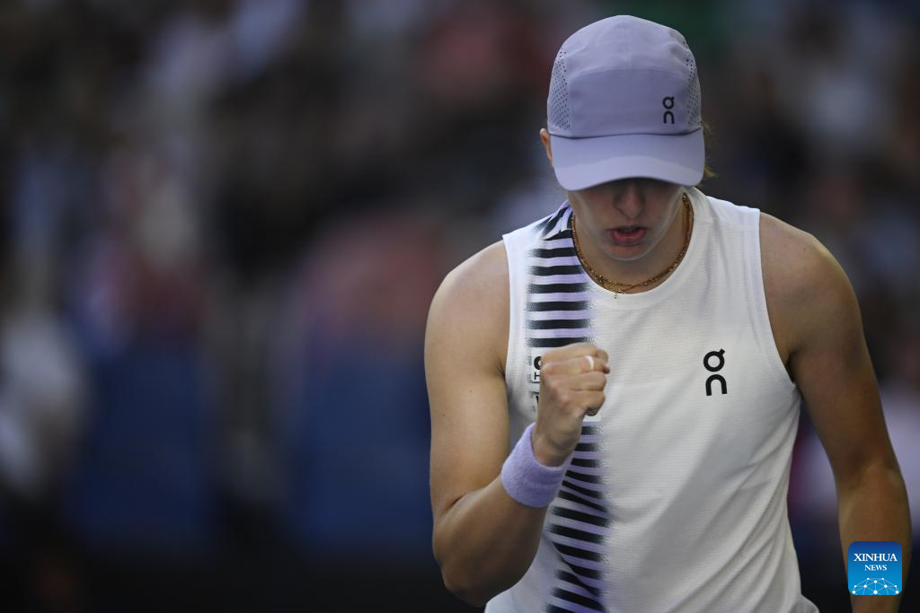 Iga Swiatek of Poland reacts during the women's singles 2nd round match against Marie Bouzkova of the Czech Republic at the Australian Open tennis tournament in Melbourne, Australia, Jan. 22, 2026. (Photo by Wang Shen/Xinhua)
