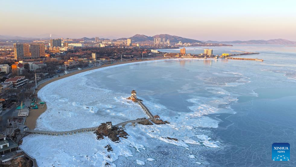 A drone photo taken on Jan. 21, 2026 shows a view over sea ice in Xingcheng of Huludao City, northeast China's Liaoning Province. (Photo by Tian Jia/Xinhua)