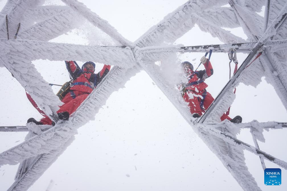 Workers deice on a power tower in Zouma Town of Hefeng County, central China's Hubei Province, Jan. 21, 2026. Facing widespread low-temperature with severe icing on power lines in some high-altitude areas in Hubei Province, power maintenance staff conducted patrols to ensure the stable operation of the power grid. (Photo by Qin Tao/Xinhua)