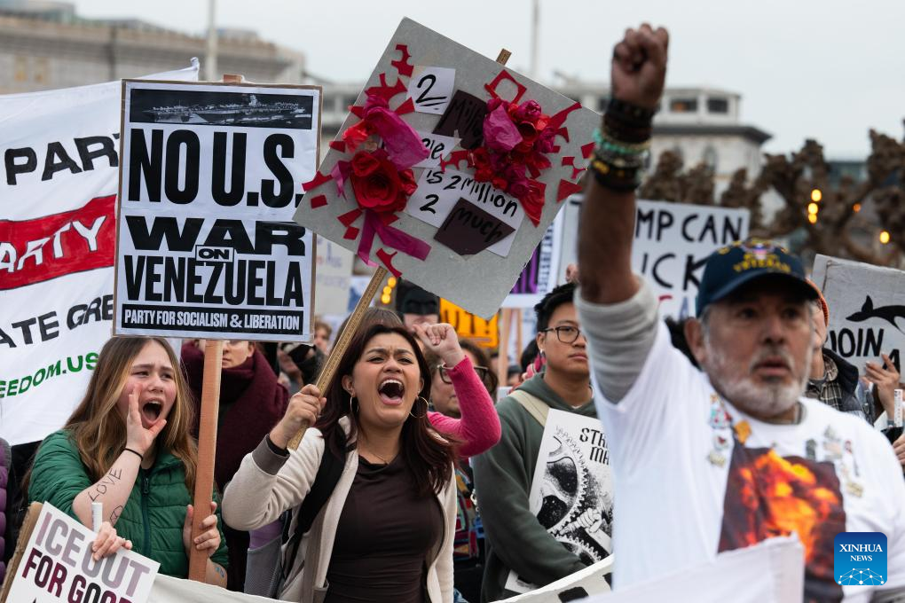 People participate in a demonstration against the Trump administration's diplomatic and immigration policies in San Francisco, the United States, Jan. 20, 2026. (Photo by Ziyu Julian Zhu/Xinhua)