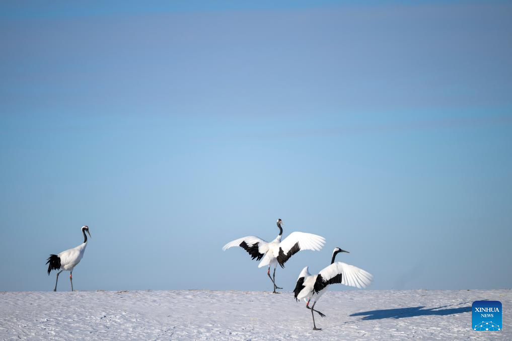 Red-crowned cranes are pictured at the Zhalong National Nature Reserve in northeast China's Heilongjiang Province, Jan. 21, 2026. (Xinhua/Zhang Tao)