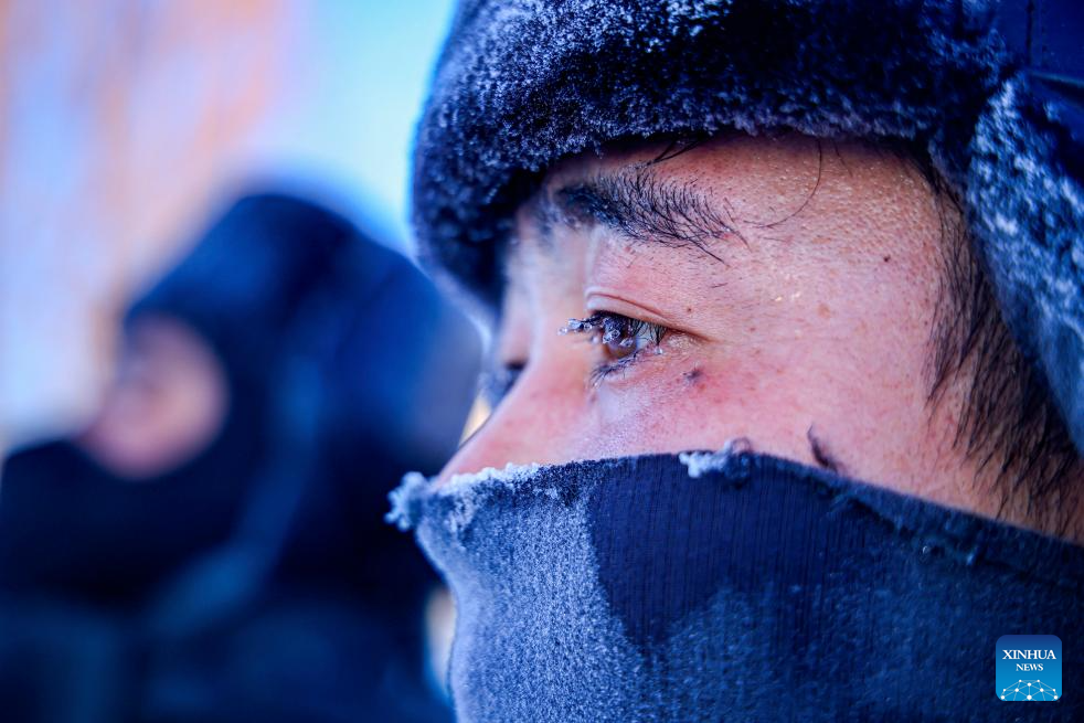 This photo taken on Jan. 16, 2026 shows the face of a power supply station employee, with ice and frost clinging to his eyelashes and face mask during a patrol, in Turgun Town of Fuyun County in Altay Prefecture, northwest China's Xinjiang Uygur Autonomous Region. A cold wave has swept across the region in recent days, with temperatures in parts of Altay Prefecture dropping to minus 47 degrees Celsius. Amid strong winds and snow, local authorities in charge of transport and energy sectors have coordinated their efforts to ensure uninterrupted heating service and daily supplies for the residents. (Photo by Nurbek Nurman/Xinhua)