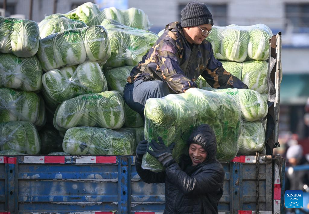 Staff members transfer bags of vegetables at a market in Saybag District of Urumqi, northwest China's Xinjiang Uygur Autonomous Region, on Jan. 21, 2026. A cold wave has swept across the region in recent days, with temperatures in parts of Altay Prefecture dropping to minus 47 degrees Celsius. Amid strong winds and snow, local authorities in charge of transport and energy sectors have coordinated their efforts to ensure uninterrupted heating service and daily supplies for the residents. (Xinhua/Wang Fei)