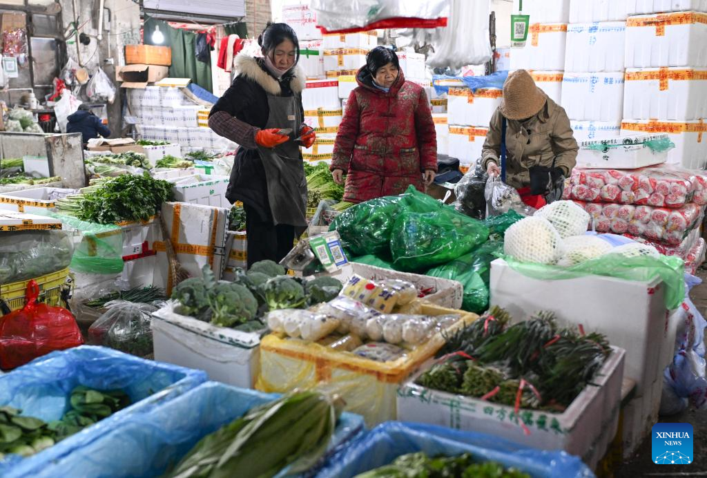 Residents purchase vegetable at a market in Saybag District of Urumqi, northwest China's Xinjiang Uygur Autonomous Region, on Jan. 21, 2026. A cold wave has swept across the region in recent days, with temperatures in parts of Altay Prefecture dropping to minus 47 degrees Celsius. Amid strong winds and snow, local authorities in charge of transport and energy sectors have coordinated their efforts to ensure uninterrupted heating service and daily supplies for the residents. (Xinhua/Wang Fei)