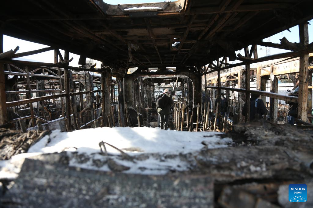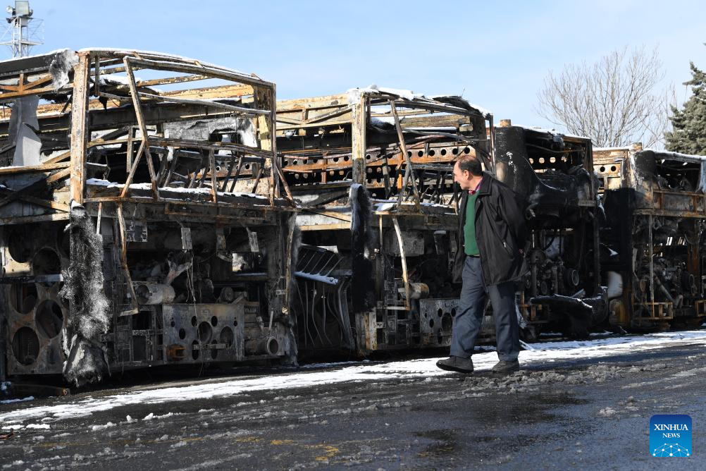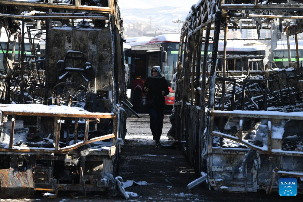 A man passes by destroyed buses during recent unrest in Tehran, Iran, Jan. 21, 2026. Iran's state television IRIB reported on Wednesday that 3,117 people were killed during recent unrest, citing the country's Forensic Medical Organization. (Xinhua/Shadati)